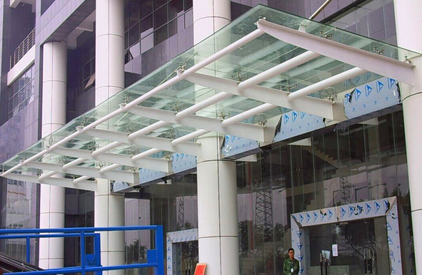 玻璃雨棚,是以鋼結構框架為主要結構,選用優(yōu)質Q235材質的系列鋼管,包括鋼柱、鋼主梁次梁等。鋼結構是通過冷彎成型的彎圓設備彎制的。鋼注與基礎面的的銜接采用預埋件或螺桿錨固技術。玻璃一般采用兩層夾膠工藝,確保破了一層還有一層,傷不到人。