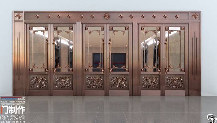 美觀性:銅門之所以受人喜愛,很大程度上與其精美的裝飾工藝有關(guān),精美的銅工藝用在銅門上,主要是一些經(jīng)過浮雕、鏤空、鍛打后的花紋和吉祥圖案。
